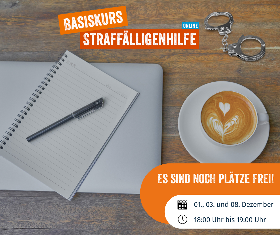 Im Basiskurs Straffälligenhilfe online erfahren Sie all das. Ab dem 13. Oktober können Sie an drei Abenden mit dabei sein, jeweils eine Stunde. Kosten entstehen Ihnen nicht, wir freuen uns aber über eine Spende.